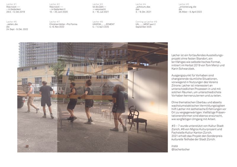 Løcher ist ein fortlaufendes Ausstellungsprojekt, seit 2019, initiiert von Karin Schwarzbek und Tom Menzi.